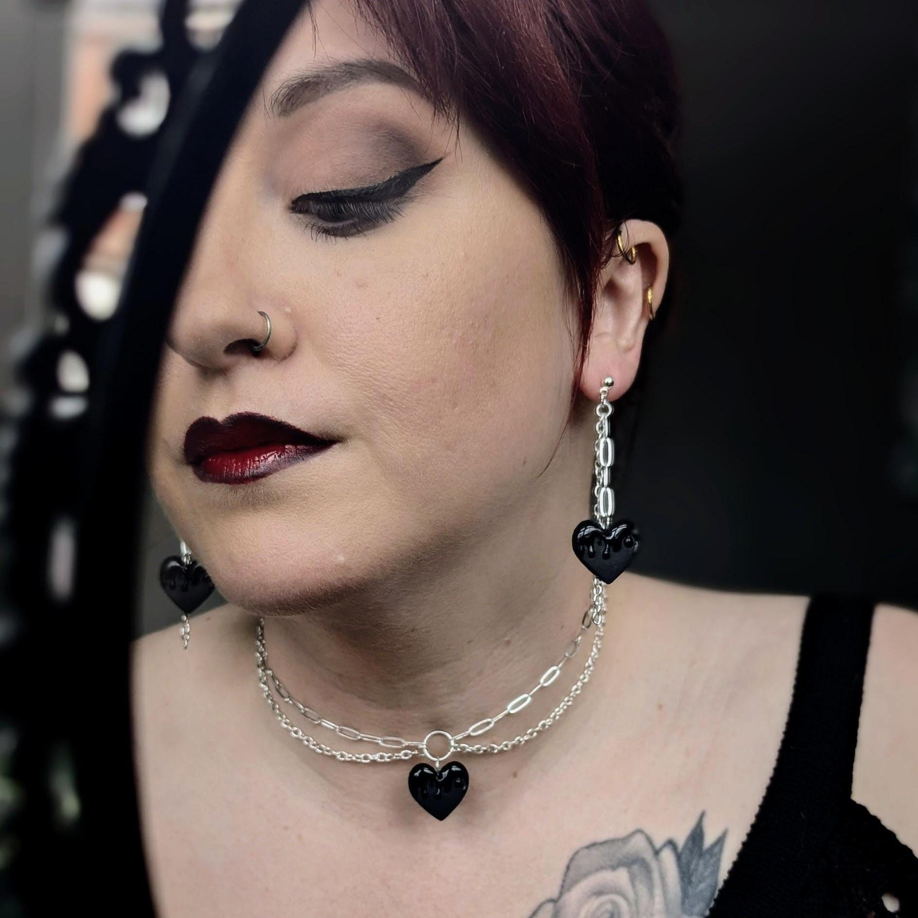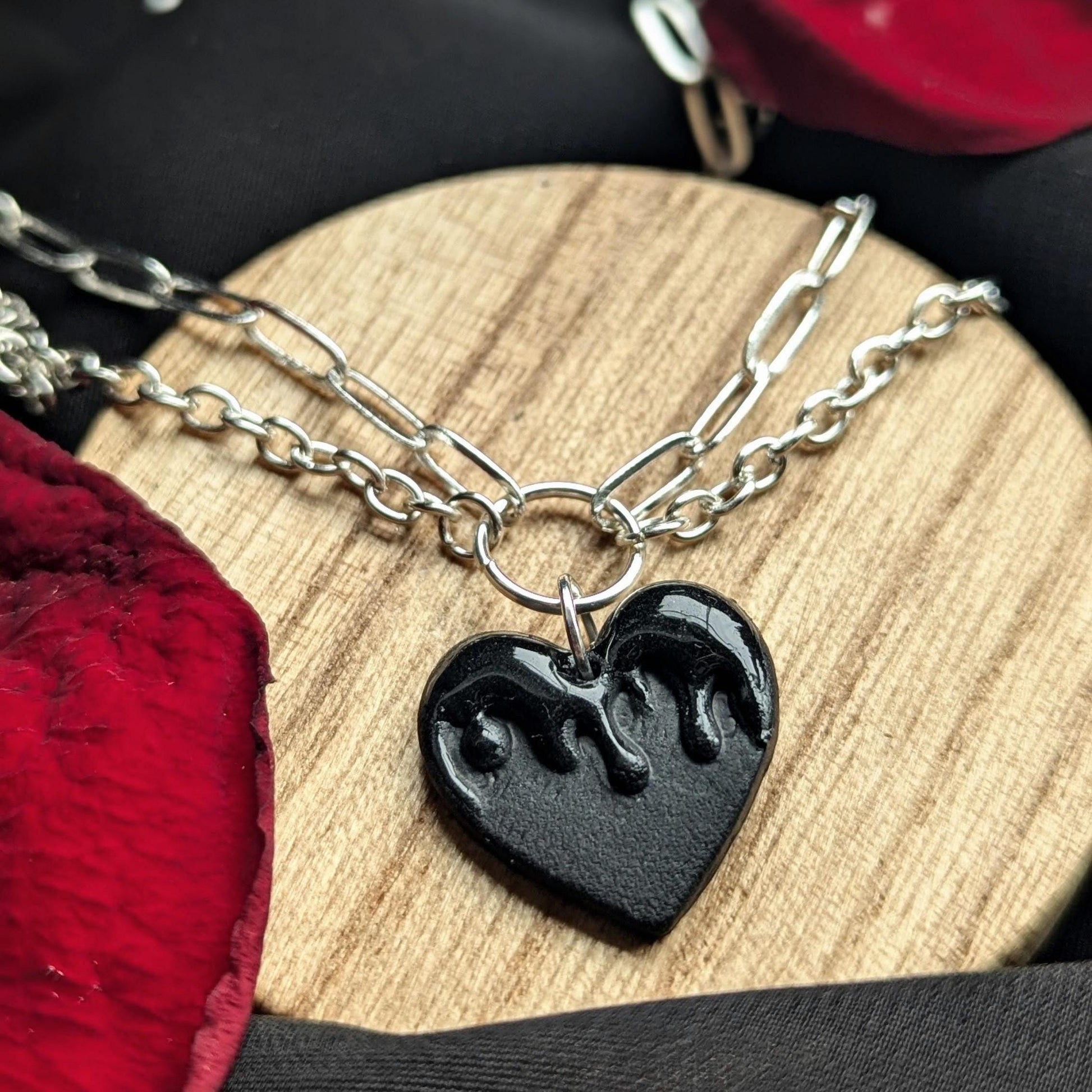 Double silver-plated chains combine to hold a black clay melting heart with a stunning matte/gloss contrast. The matching earrings add an extra layer of romance.