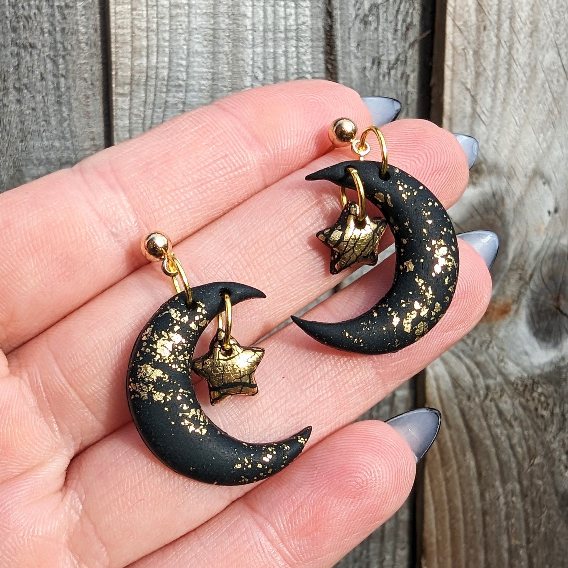 Celestial crescent moon and star dangles in black and gold. The charms are made from polymer clay and attached to gold plated ball post studs.