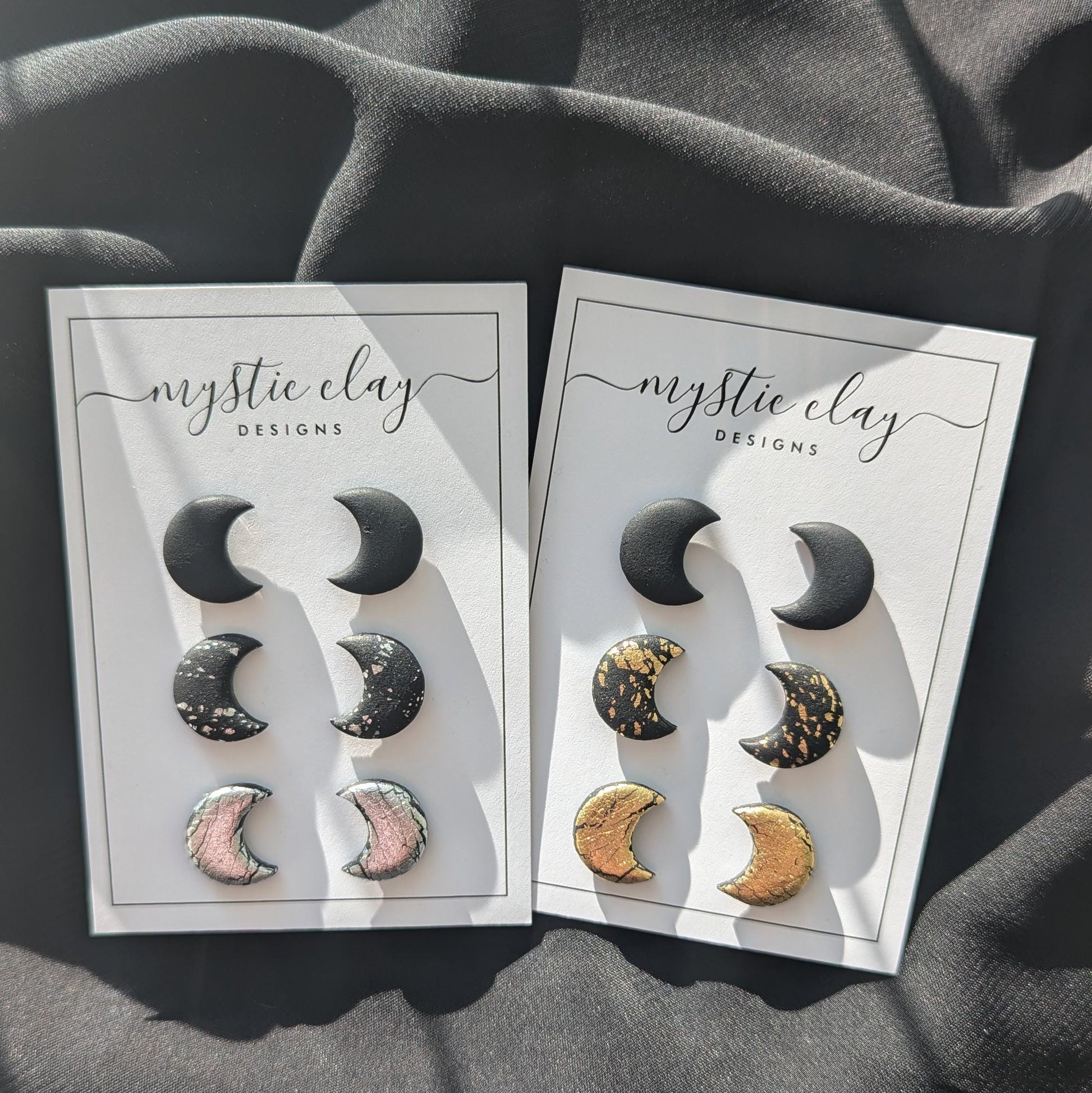 A beautifully dark gothic set of 3 moon studs in a choice of either black & silver or black & gold. Wear each pair separately or mix and match the colours!