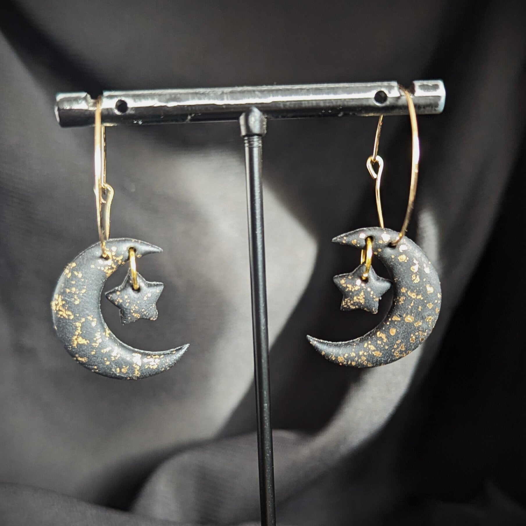 Delicate hoops featuring a gothic style moon and star in black with gold flecks.