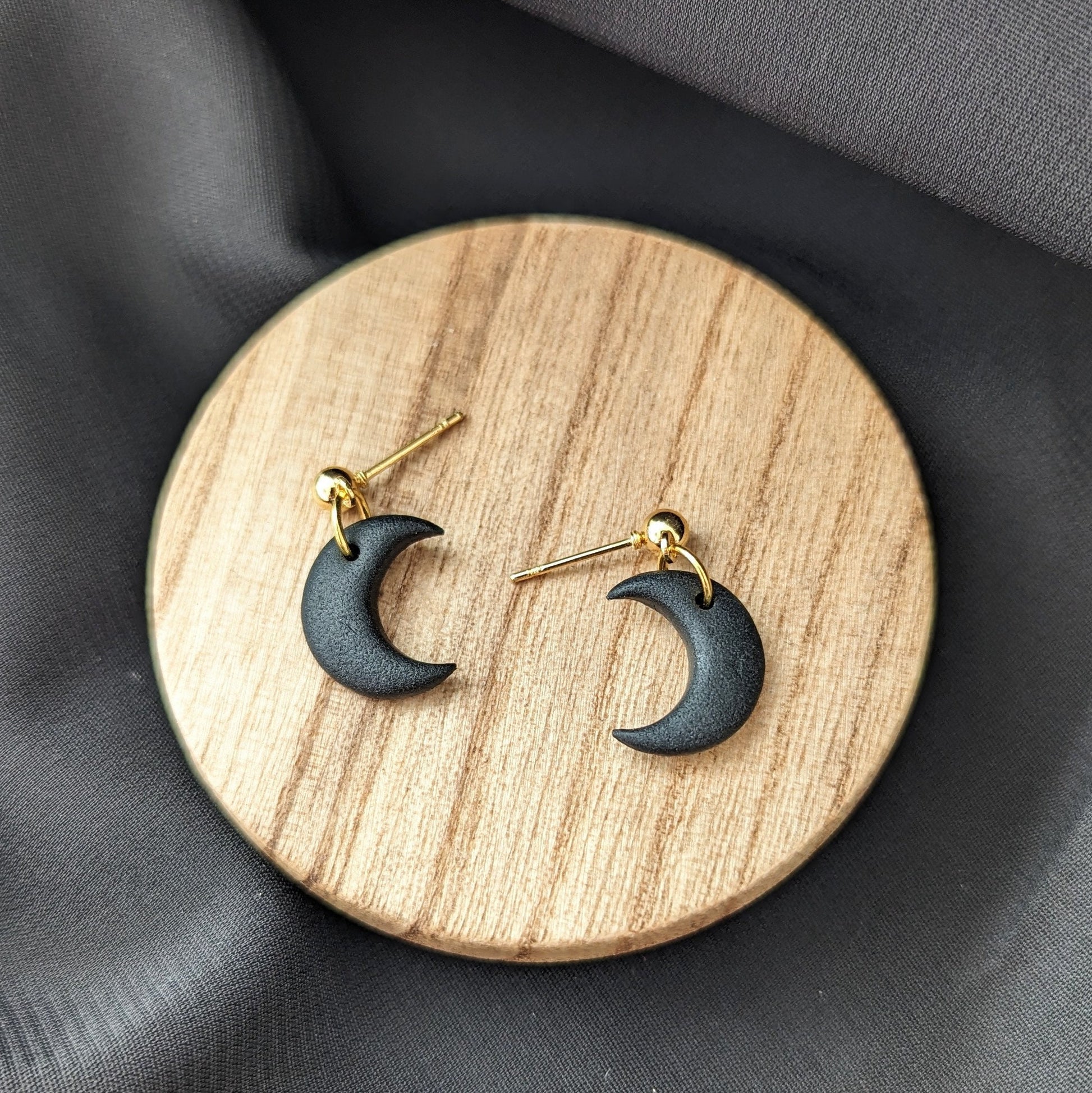 Black gothic moon phase dangles on gold plated ball post studs. Perfectly dark and witchy.
