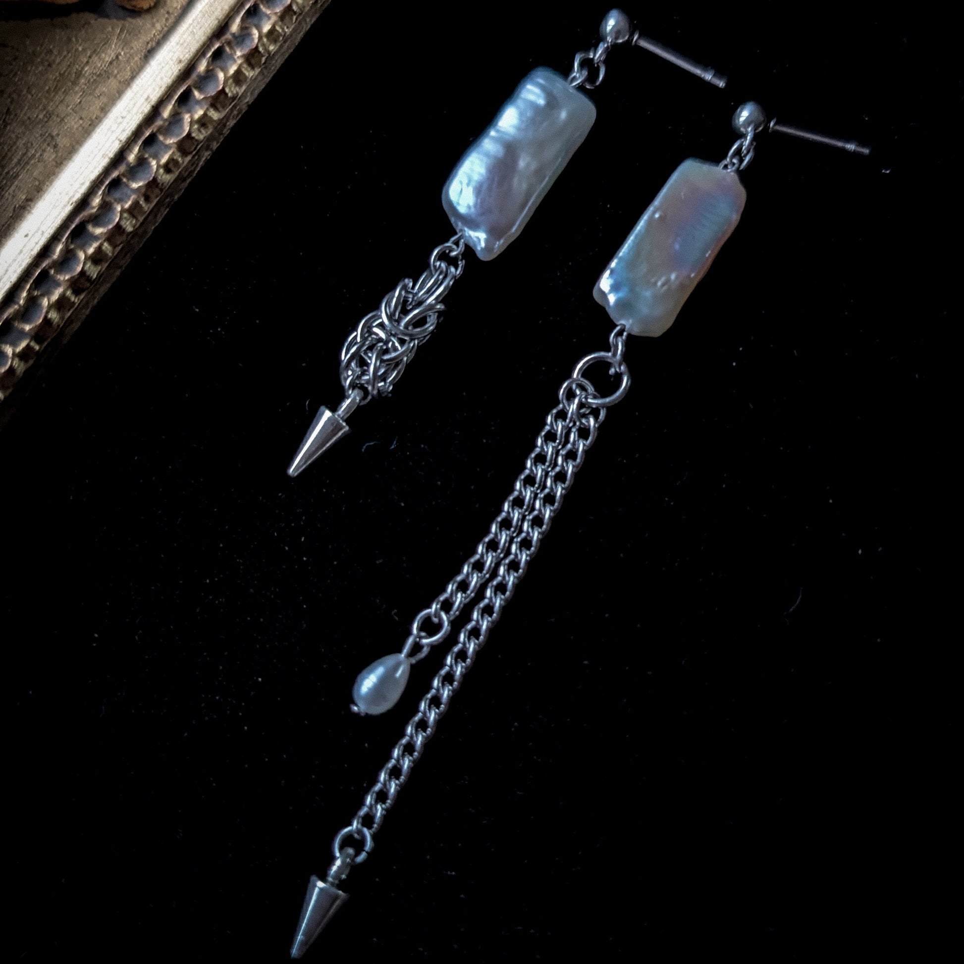 Iridescent baroque pearls hang from dark metal hardware, paired with asymmetric chains and spike accents for a striking alt-inspired silhouette.